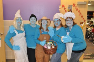 Our creative staff enJOYs the opportunity to occasionally move out of clothing comfort zones and into more challenging wardrobes, such as the third grade Smurfs/Smurfettes: