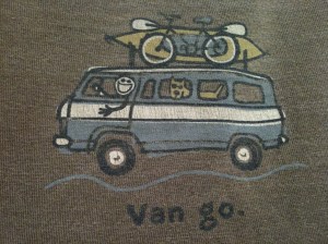 Anyway, the simple messages are powerfully shared on their products:  Celebrate; face the bumps in life with a smile; create balance; do what you like and like what you do . . . the list is endless.  I own more shirts than I can wear in a week and give them to everyone as gifts.  Yes, they are comfortable, sturdy shirts, but it’s the message I cherish the most.  You can see my favorite shirt here (“Van Go.” packed for a road trip).  🙂