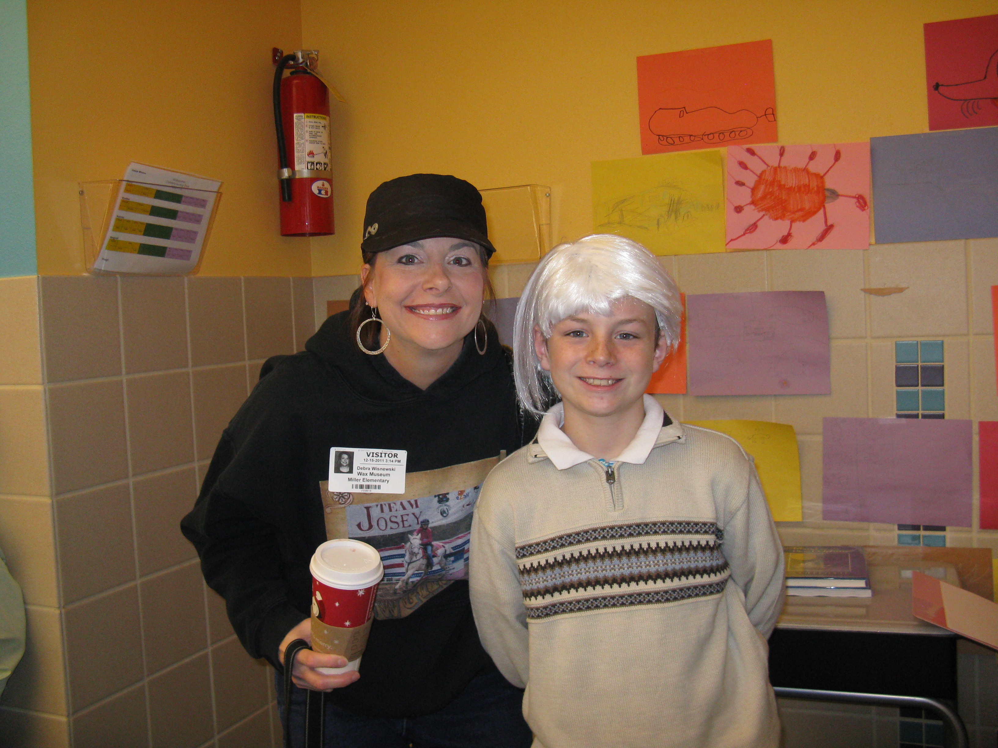 Third graders shared a wax museum with our school this morning.  When you pushed a button, the figures came to life to share facts about themselves.  Here’s Scott O’Dell (Wes) with a visitor.  Mrs. Griffin-Loftis is listening to Whitney talk about her work at NASA too!