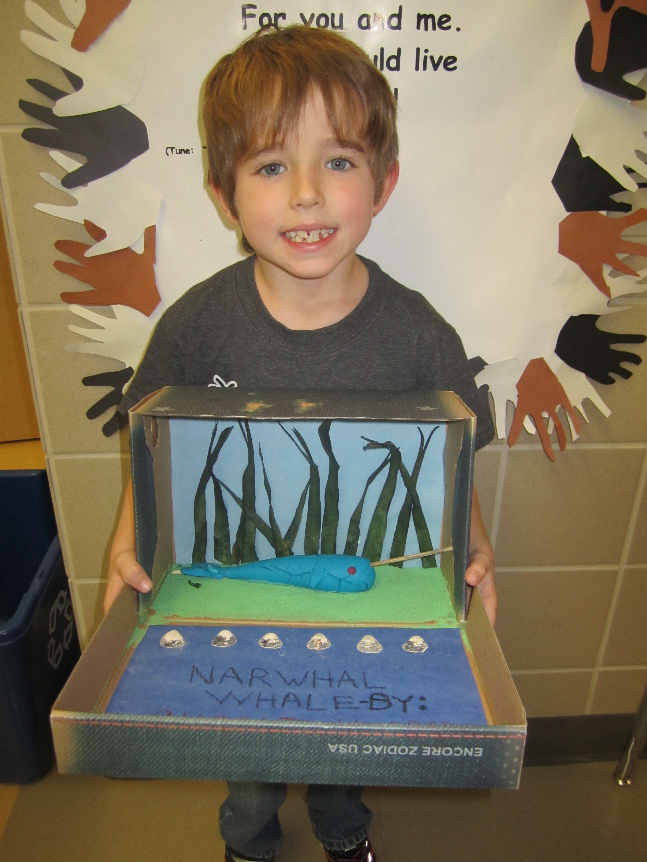 So yesterday morning while unloading cars and buses, our first grade friends were carrying in their Arctic Animal Projects–not one first grader said “the dog ate my homework!” Their enthusiasm for everything they learned during this project fascinated me, so I took some time today to ask some questions about their work. One child shared how they were each given an Arctic animal (everything from polar bears and killer whales to harp seals and walruses) to “talk about and report back to the class on; we