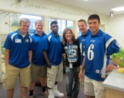 Several of the MHS Varsity Panther football players then joined us for Friday Story Time.  Even after an early morning full of activity for these young men, they joined us with great smiles and enthusiasm while sharing stories with our youngest readers.  Here is Mrs. Samek (3rd grade teacher) with some of the guys before they left (she knows the one to her left the best since he’s her son, Cody).  We greatly appreciate the outstanding academic example they set for our learners and the valuable time they give to us (even on important game days!).
