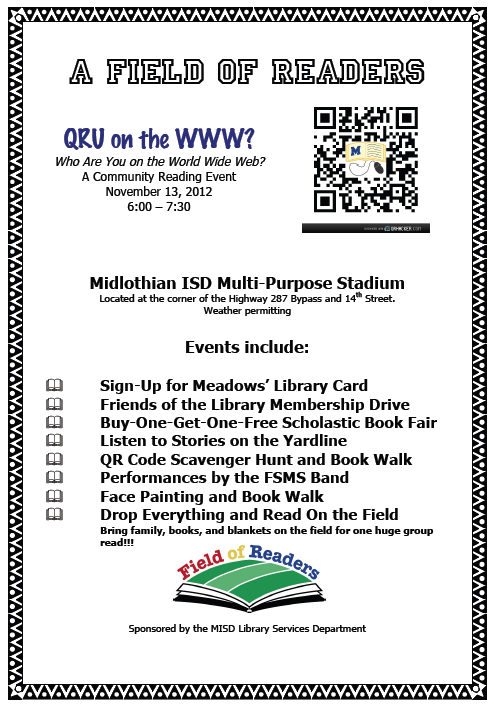 It’s time for the annual MISD Field of Readers Event next Tuesday, November 13 from 6:00 to 7:30 p.m. at the Multipurpose Stadium. Families and community members always enjoy this creative fun experience where we drop everything and read on the field, listen to stories on the yard line, purchase books at the Scholastic Book Fair, join the community library, participate in the Book Walk and QR Code Scavenger Hunt, and so much more! We look forward to seeing you!