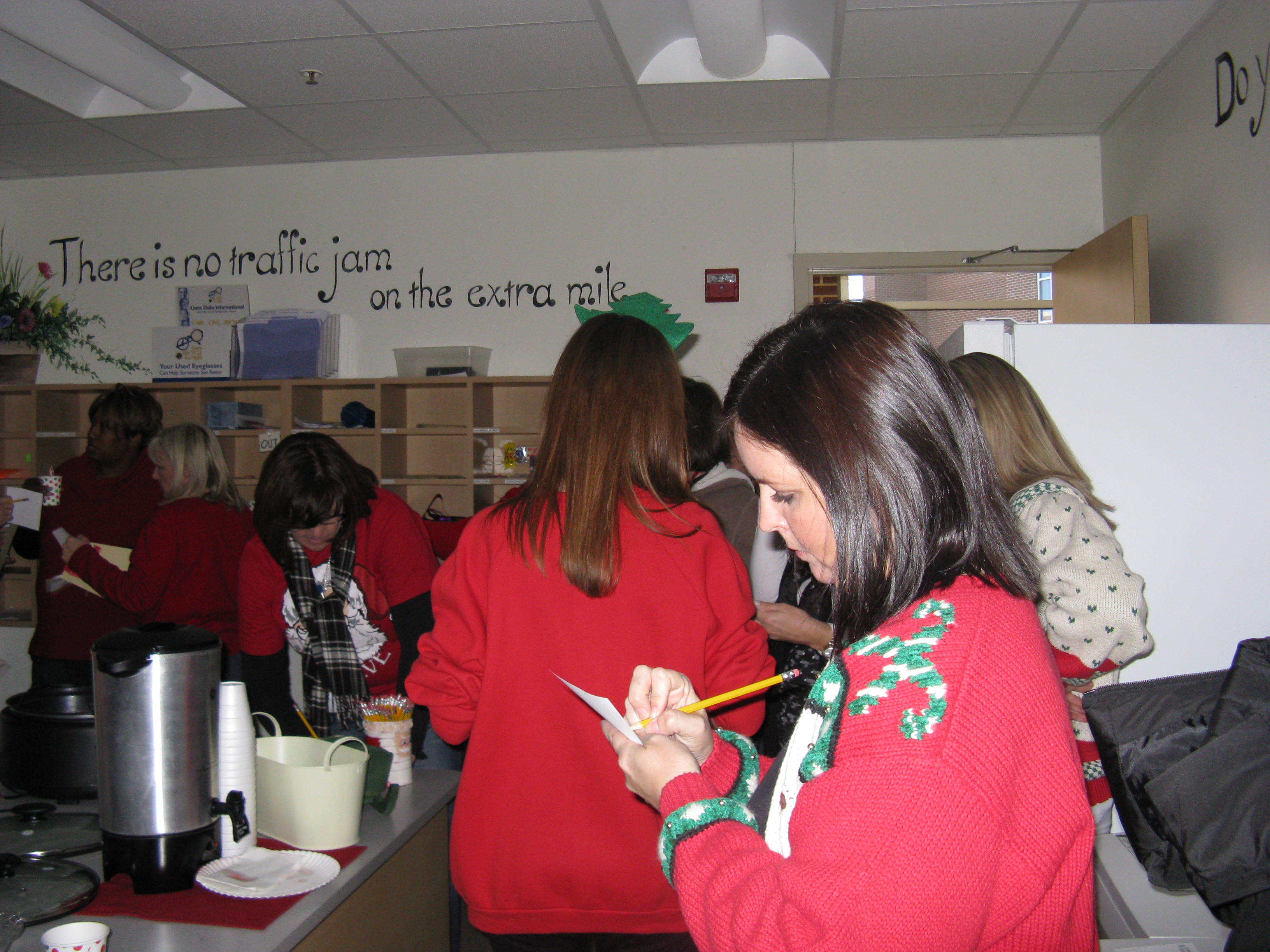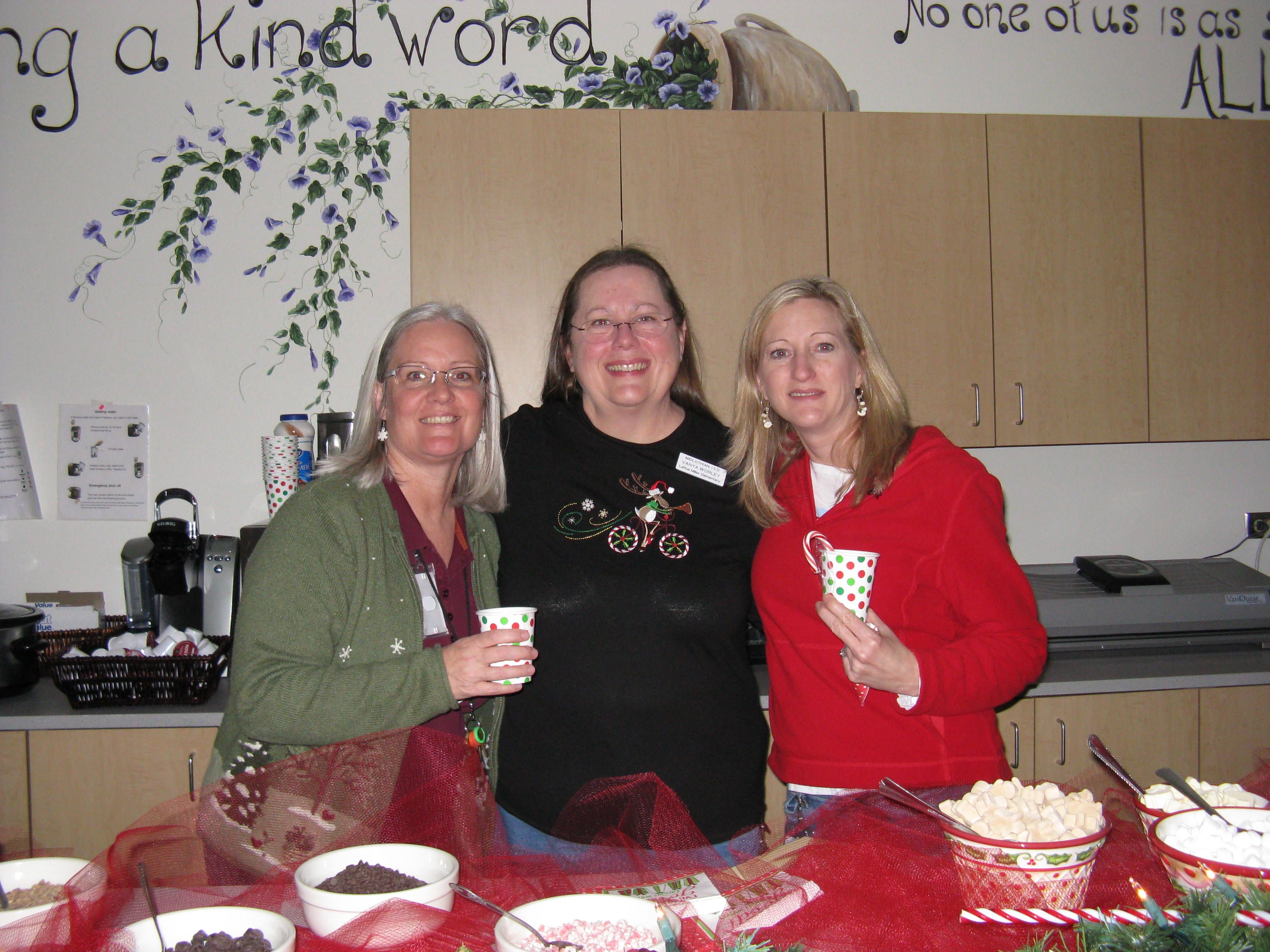 cocoabar1As is a Miller Staff family tradition, we frequently gather everyone together to share eats and treats, but try to take it a step above before we scatter in multiple directions during the holiday break.  We enJOYed a holiday hallway happy hour yesterday afternoon with a scrumptious hot cocoa and cider bar (special thanks to our Miller Office Elves for all their work in gathering and preparing!).  Staff members created unique combinations of hot (school-appropriate, of course 🙂 ) drinks and took time to visit with one another while milling around checking out everyone’s “vintage” holiday sweater wear.  cocoabar3Teachers, as you know, are notorious for their extensive collection of holiday sweaters, sweatshirts, shirts, pins, jewelry, and sundry other items).  Votes were cast for special prizes in the following categories: