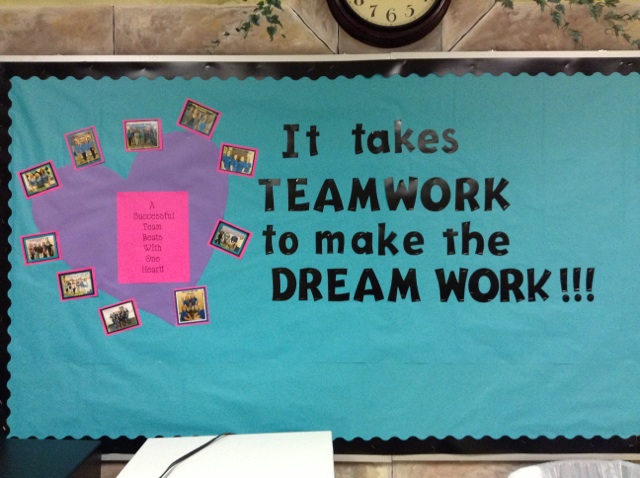 teamworkToday, while walking through the classroom of this friend, the child asked to speak “private” with me.  🙂  We decided to go for a little walk and run a couple of errands together in the school.  During our walk, we stopped in the lounge to fill my glass with ice and the child noticed the staff board with pictures:
