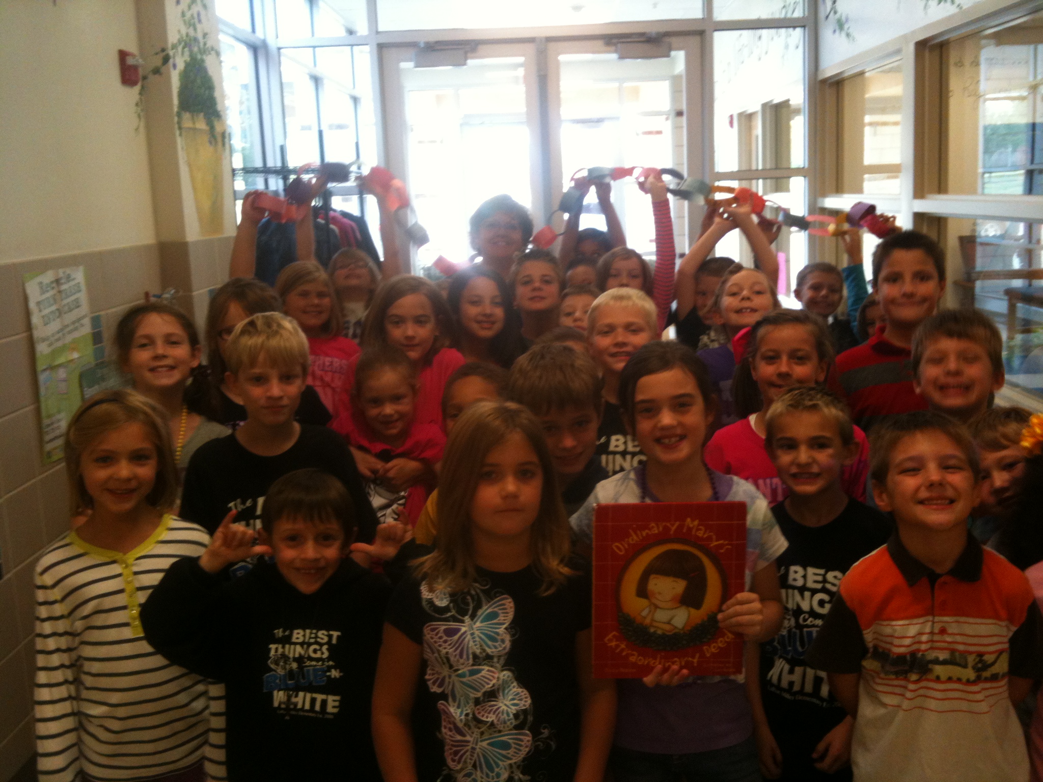 third grade homeroom and Mrs. Stanley’s first grade homeroom read and talked about one of my favorite books, Ordinary Mary’s Extraordinary Deed by Emily Pearson. Little Mary picks some blueberries and leaves the basket on Mrs. Bishop’s porch. Mrs. Bishop finds the blueberries and bakes some yummy muffins to secretly share with five friends. Each friend, in turn, does an ordinary deed for five more friends and the story continues…