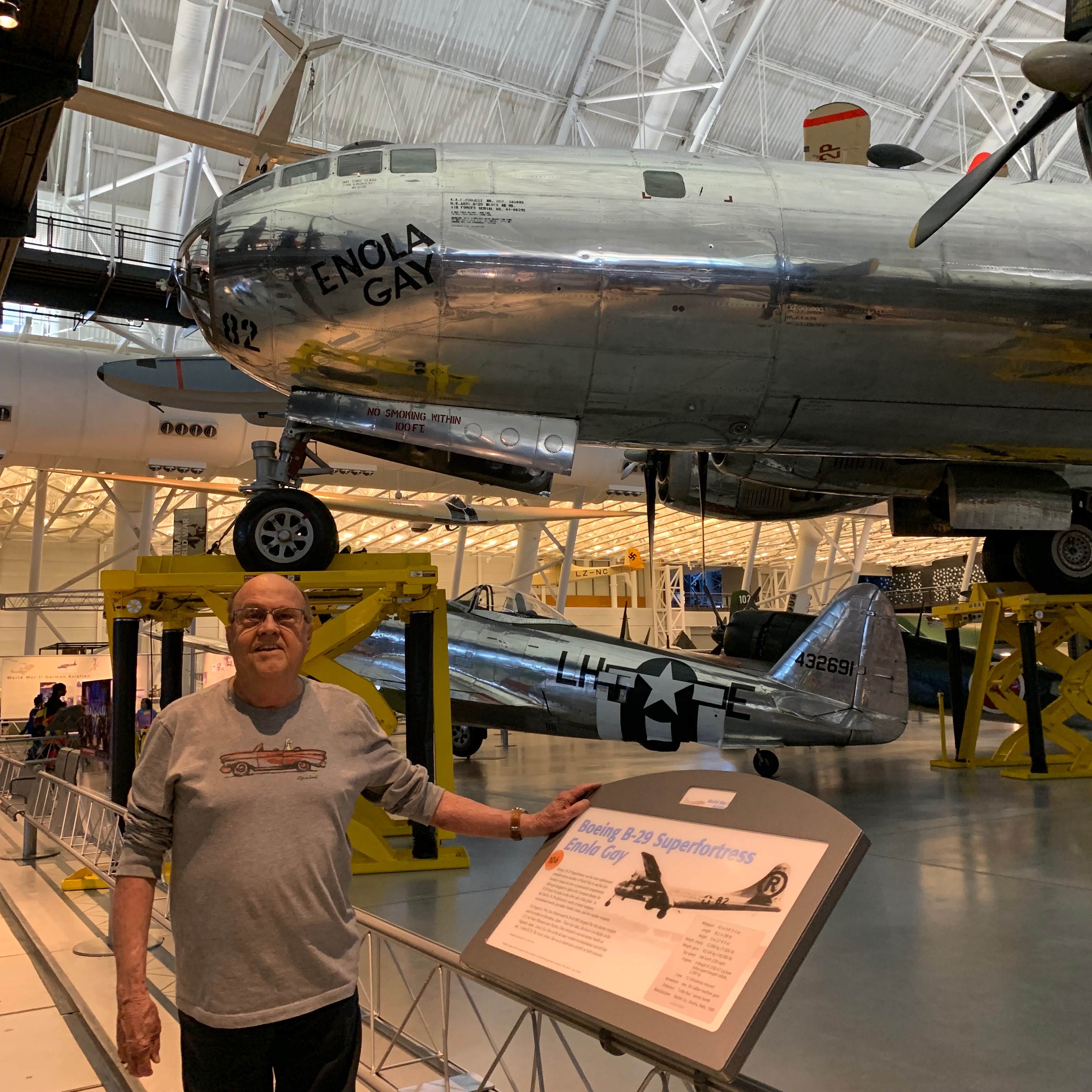 As we entered the age of WWI and WWII (and picked up dad with a group of five elementary-age girls), the aircraft were divided among the various service organizations, their important missions, and successes. We stopped at length in front of the Enola Gay, when the world entered into the atomic age in August of 1945. This B-29 Superfortress bomber flew some 1,500 miles from the island of Tinian to drop an atomic bomb on Hiroshima, Japan, thus forever changing the course of world history. POP KNOWS ALL ABOUT THIS PLANE and he left no detail to chance! You see, dad grew up across the street from the sister of Colonel Paul W. Tibbets (later Brigadier General), the pilot of this infamous mission. Pop spent many childhood hours visiting, questioning, and listening to Tibbets’ stories, later talking with him at airshows around the country…but back to the museum. It was about this time I noticed an even larger group gathered around us…a museum docent with a senior citizen group of six and then nine middle-school-age guys. Dad continued sharing vast knowledge, answering questions presented to him on aviation, and talking like the flying expert he is. About four hours later, Pop stopped, looked at me, and asked if we could sit down for a snack. The docent gave him a museum hat and said, “you’re hired.” The mom, dad, and children cheered in thanks. The middle school guys each shook his hand and thanked him personally with one commenting, “you’re the BEST part of this trip today, and by the way, you look great to obviously be 90-something!” (Pop’s not even 80 yet 🙂 )