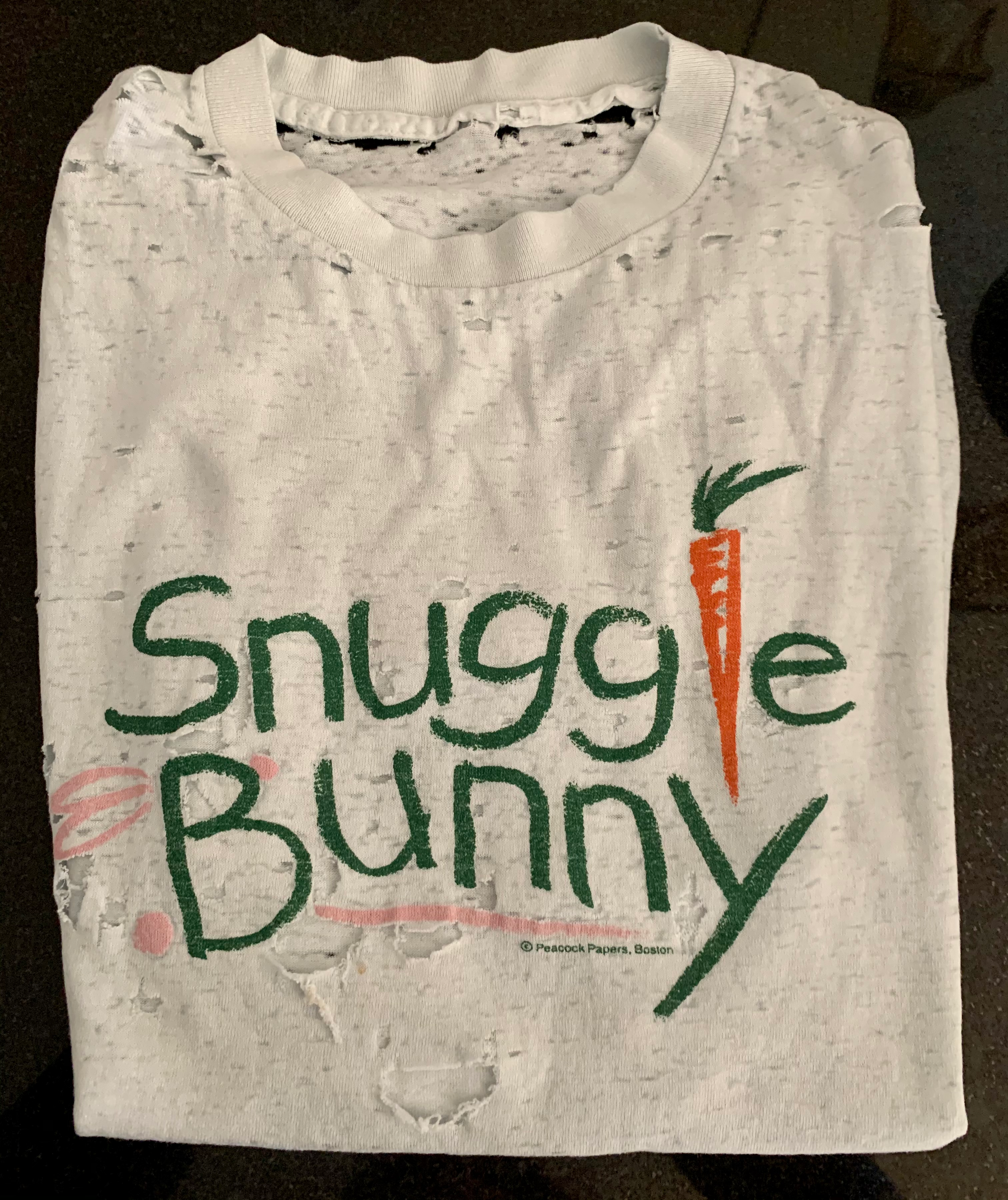 My favorite term of endearment, “Snuggle Bunny,” came into being before I married St. M (not very manly, but it makes him grin even today). When our oldest was born, we both used the term “Snuggle Bunny” as we hugged her up. Her first Easter, I stumbled across a t-shirt with this phrase (who knew?) and she “‘gave it” to her daddy as a surprise. He wore it proudly until she asked to wear it to sleep one night at about age 3. She wore the t-shirt as a night shirt until her baby sister took it over about five years later.